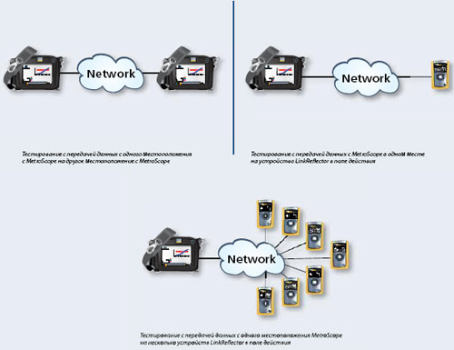 Для тестирования нескольких сетевых соединений один анализатор MetroScope может взаимодействовать с неограниченным числом устройств LinkReflector, которые не только «отражают» трафик, но и сами по себе являются мощными диагностическими приборами.