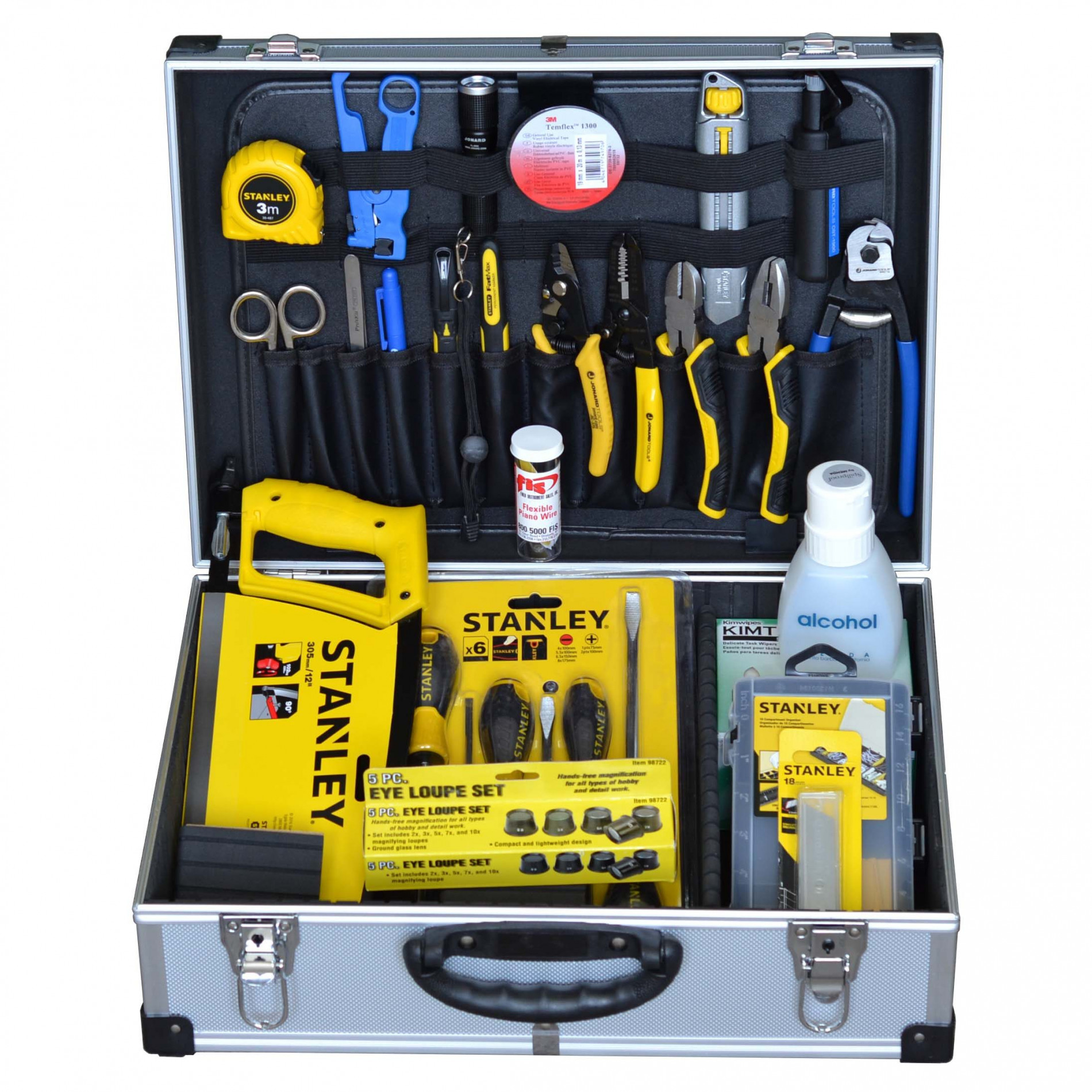 Усі інструменти надійно розміщуються в міцному алюмінієвому кейсі з регульованими перегородками, що забезпечує зручне транспортування та організацію робочого місця. Такий набір стане незамінним для монтажних бригад та сервісних інженерів, адже дозволяє виконувати повний цикл робіт з оптичними мережами – від підготовки кабелю до якісного очищення та маркування з’єднань.